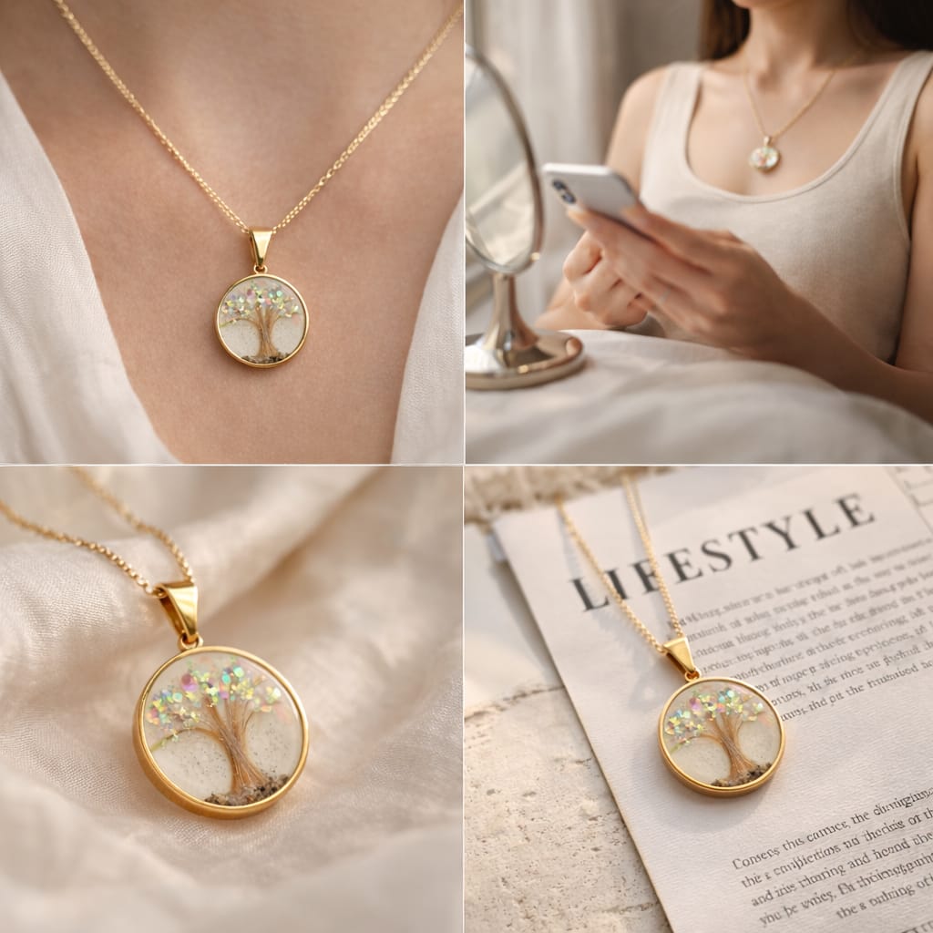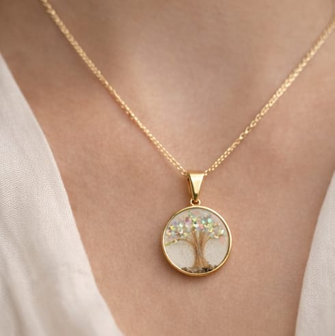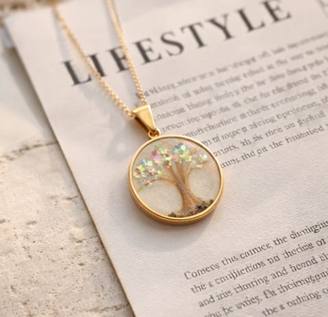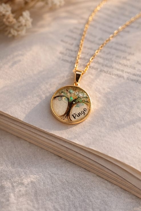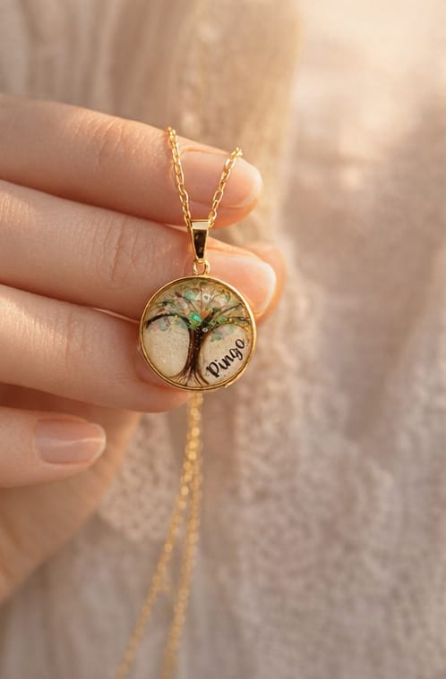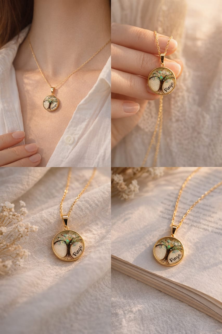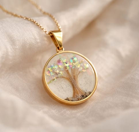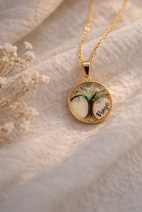 Feito artesanalmente com resina epóxi de alta qualidade, este pingente de 2×2 cm em moldura banhada a ouro é uma cápsula de amor e lembrança. Pode conter elementos únicos como cabelos, dentes de leite, leite materno, pelos de animais ou cinzas de cremação — transformando momentos especiais em uma jóia eterna.