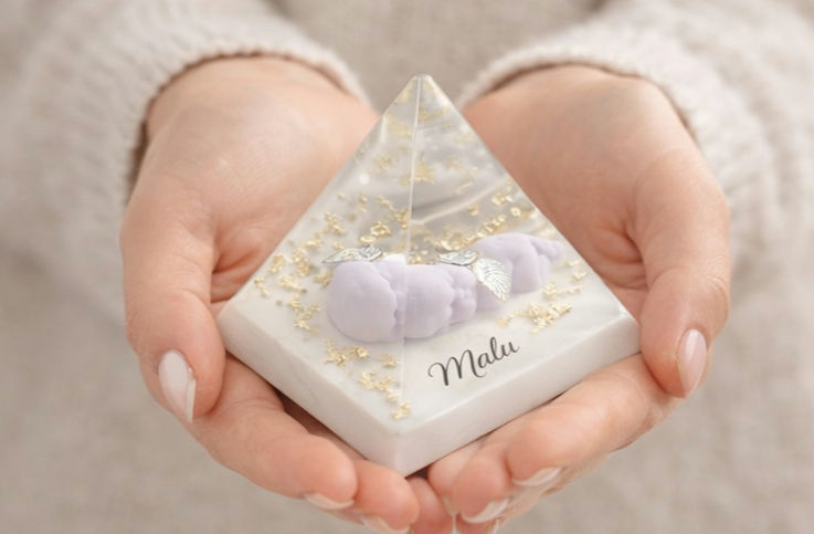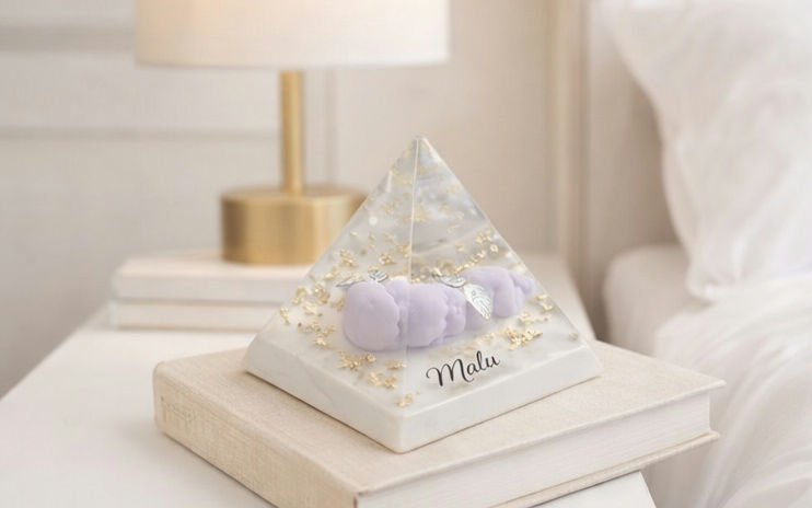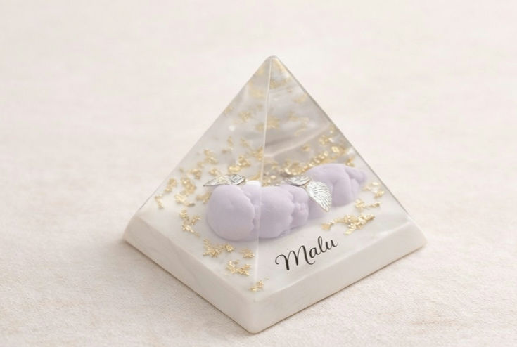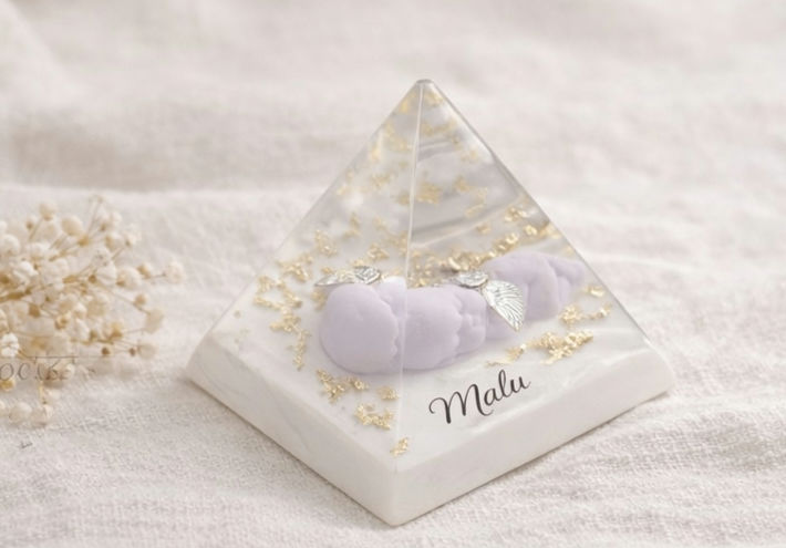 Cada pirâmide é moldada artesanalmente em resina cristal, com transparência e brilho que revelam a beleza dos sentimentos guardados. Ideal para homenagear pessoas queridas ou pets amados, ela é uma jóia emocional que decora e toca.