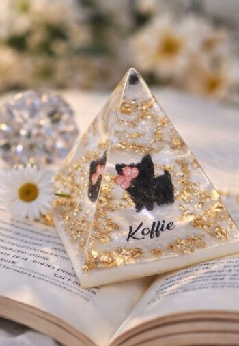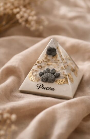 A Pirâmide Afetiva em resina é uma peça delicada e simbólica, feita para eternizar os laços mais profundos da vida. Com 4,5 x 4,5 cm, ela pode incorporar elementos únicos como pêlos de animais ou cinzas de cremação — transformando lembranças em arte.